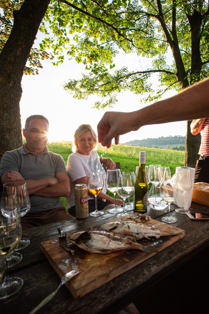 Trochu jsem se bála, že to bude vyžadovat od Václava nekomfortně velký freestyle a improvizaci. Navíc pro 100 hostů. Na první schůzce mě však ohromil odvahou, s jakou výzvu přijal a navíc připravenými variantami menu, které i v takových podmínkách bude schopný vytvořit. Nadšeně s námi plánoval menu tak, aby reflektovalo to, kdo jsme, s humorem reagovalo na náš životní příběh a inovativně bavilo svatebčany. Dál jsme se nemuseli o nic starat. Vše okolo občerstvení zařídil, dovezl a na starých kamnech bezchybně uvařil. Vidět Václava při práci a účastnit se příprav byl zážitek pro nejbližší prátele, kteří přijeli už v predvečer svatby. Výsledkem bylo vizuálně nádherné, surovinově nadčasové a chuťově bezchybné menu šité nám na míru připravené přímo na našem vysněném místě.“
